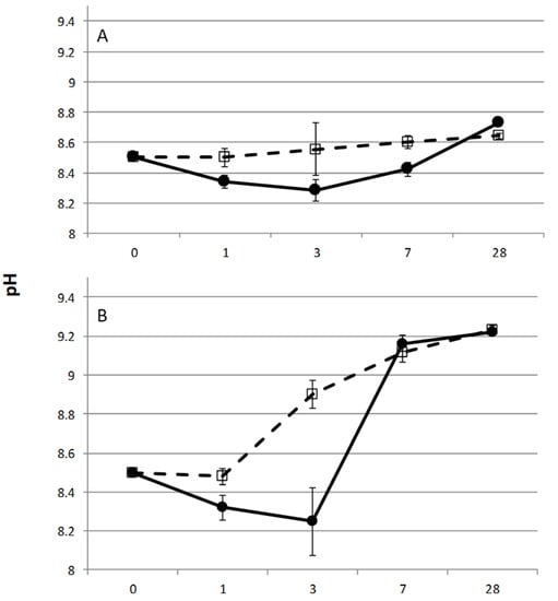Culture medium pH. The pH of the nutrient solution was measured with a pH-meter on days 1, 3, 7, and 28 of culture when the nutrient solution was renewed with a fresh solution, under sterile conditions.