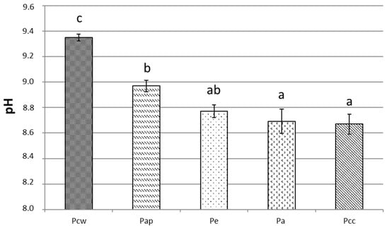 Since no interaction (p = 0.676) was found between NaHCO3 treatment and Pyrus spp hybrids, the analysis of the acidification capacity of the different genotypes (Figure 5) showed that Pcc had the highest capacity to acidify the medium, followed by Pa and Pe. Contrastingly, Pcw is less able to acidify the medium than the other four species.