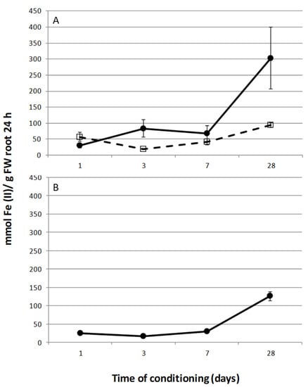 Iron reduction. The ferric chelate reductase (FC-R) activity was monitored in all genotypes following the protocol adapted by []. Four plants per genotype and the treatment were incubated in amber vials containing 11 mL of fresh nutrient solution, with 0.3 mM BPDS and 100 µM Fe(III)-EDTA solution pH 6.0 at a temperature of 24–26 °C, photoperiod 16 h light / 8 h dark (100–150 μEm−2s−1) for 24 h. The ferric chelate reductase (FC-R) activity was measured in absorbance at 535 nm with a spectrophotometer. The amount of reduced iron was calculated from the concentration of the complex Fe(II)-(BPDS) using an extinction coefficient of 22.14 mM·cm−1, and it was expressed in nmol Fe(II) reduced g−1 FW root h−1 [,]. This determination was performed on days 1, 3, 7, and 28.