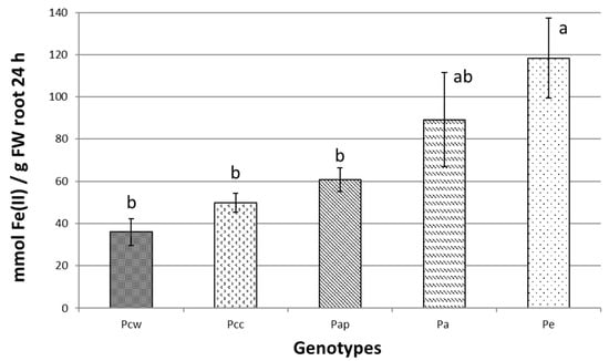 Overall NaHCO3 concentrations and time of conditioning (Figure 7) for Pe and Pa interspecific hybrids showed the highest iron reduction capacity. At the end of the conditioning time, the FC-R activity of Pe hybrids in 10 mM NaHCO3 was 2-fold higher than with 20 mM (Figure 6) and 3-fold higher than that of the other three interspecific hybrids (Pa, Pap, Pcc) or the open pollinated Pcw.
