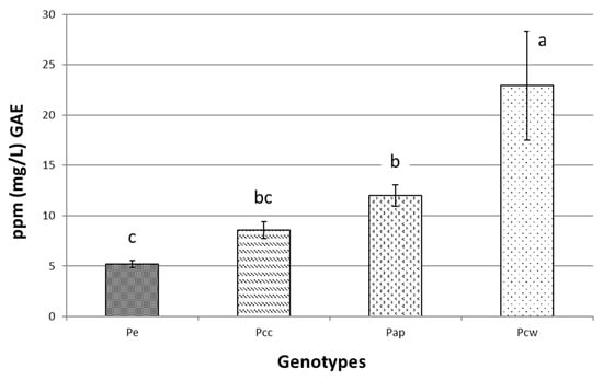 ), which have the same performance. Mean values come from the measures taken on the culture medium of four replicates, one plantlet each per genotype. Bars represent the standard error.