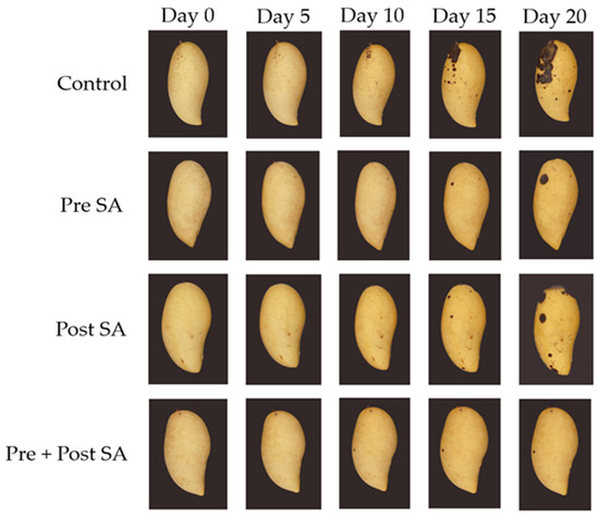 The visual appearance of the mango fruit can be seen in Figure 1. Control fruit showed decay at the end of the storage period. Fruit that received the Pre + Post treatment maintained good appearance compared to the control and other treated fruits. Fruit decay is one of the most important parameters affecting postharvest shelf life. No fungal infection was observed on the fruit during the first 10 days of storage (Figure 2A). After that, the control fruit quickly decayed, and the percentage of decayed fruit was higher than that of all the SA-treated fruit. There were no significant differences among the SA-treated fruit, with all treatments having around 20% decay on days 15 and 20. SA promotes the expression of pathogenesis-related genes, thereby conferring resistance to pathogens [27]. The combination of pre- and postharvest SA treatments also had the most beneficial effects on storage life and fruit quality of tomato fruit, including reductions in decay [15].