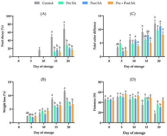 Effect of SA application on (A) fruit decay, (B) weight loss, (C) total color difference, and (D) firmness of Nam Dok Mai Si Thong mango fruit during storage at 13 °C. Vertical bars represent the standard errors of the means (n = 5). Bars annotated with different letters indicate statistically significant differences among treatments at each storage time.
