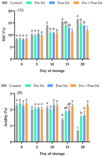 The effect of SA application on changes in the soluble solids content (SSC) of the mango fruit is shown in Figure 3A. The SSC gradually increased in both control and treated fruit. On day 10 and onwards, the SSC contents of SA-treated fruit were significantly lower (p < 0.05) compared to those of control fruit. At the end of the storage period, the SSC of fruit in the Pre + Post SA (11.82 ± 0.51%) was significantly (p < 0.05) lower than in the Pre SA (14.7 ± 0.47%) and Post SA (13.79 ± 0.15%) treatments. The SSC of mangoes increases during ripening due to starch breakdown [36] and the actions of sucrose-phosphate synthase [37], and the lower SSC in SA-treated mango fruits could be related to their ability to reduce the activity of this enzyme [38].