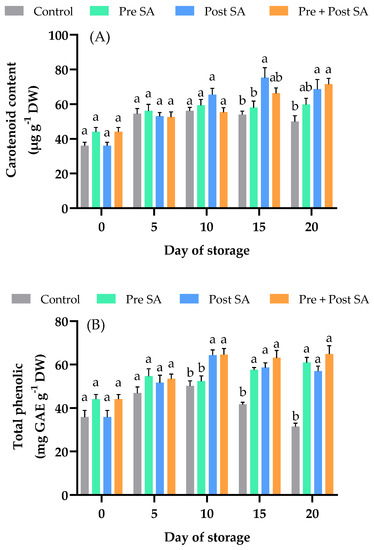 SA has been considered as an elicitor, as it increases concentrations of bioactive compounds such as phenolics, glucosinolates, carotenoids, betalains, and vitamins that promote defense responses [38]. In this study, carotenoid and total phenolic contents were analyzed to determine the effects of SA on such bioactive compounds. Carotenoids can be considered as an important factor protecting organisms against photooxidative processes [39]. The carotenoid content of the mango fruits gradually increased from day 0 to day 15 for all fruit (Figure 4A). There was also a trend for fruit that underwent a postharvest dip in SA to have higher carotenoid contents from day 15 onwards, and there was no significant difference between the Post SA and Pre + Post SA fruits during the storage period. Postharvest applications of 2 mM SA have been shown to maintain carotenoid contents in Chausa mango fruit [9].