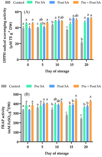 FRAP activity of all samples gradually increased up to day 15, but decreased slightly on day 20 (Figure 5B). A significant difference (p < 0.05) between control fruit and those in the Pre + Post SA treatment group was found after day 10. At days 15 and 20, FRAP activity was significantly (p < 0.05) higher in fruit that received the Pre + Post SA treatment than in fruit in the other two SA treatment groups. In a previous study, Erogul and Özsoydan [44] showed that a preharvest application of 2 mM SA increased FRAP activity in the Cresthaven peach.