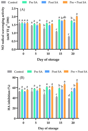 Exogenous application of SA increases anti-inflammatory activity and the production of secondary metabolites in Ajuga integrifolia Buch. Ham. ex D. Don, a plant grown as a source of medicine and for its essential oil [45], and in Centella asiatica (L.) Urban, a plant also used as a medicinal herb as well as a culinary vegetable [46]. In this study, SA treatments were applied to mango fruits to promote NO scavenging and hyaluronidase inhibition. The NO radical scavenging activity in the fruit of the control treatment gradually decreased during storage (Figure 6A). A significant difference (p < 0.05) between control and all SA-treated mango fruits was observed after day 5. On day 20, NO radical scavenging activity in fruit of the Pre + Post SA treatment was significantly higher than those in other two SA treatments.