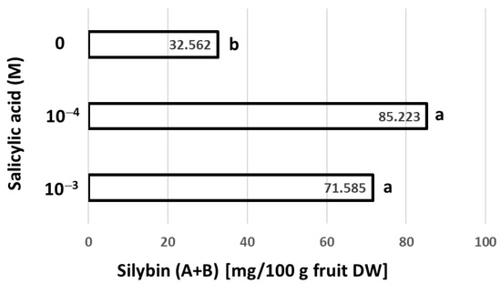 The silybin (A + B) contents in the fruits of S. marianum were analyzed using high-performance liquid chromatography (HPLC). Our results revealed that salicylic acid at the concentrations of 10−4 M and 10−3 M significantly increased the mean silybin (A + B) contents to 85.223 and 71.585 mg/100 g of fruit DW, respectively, as compared to the average content of 32.562 mg/100 g fruit D.W. for the control group (Figure 1).