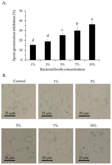 The antifungal effect of VOCs produced by the different concentrations of Bacillus velezensis CE 100 against the spore germination of Colletotrichum gloeosporioides. Percentage reduction in spore germination (A), and suppression of spore germination and germ tube elongation (B). The bacterial broth concentration of 1% is equivalent to a bacterial cell concentration of 0.02 OD600. Error bars represent the standard deviation of the mean (n = 3). Means with different letters are significantly different (p < 0.001).