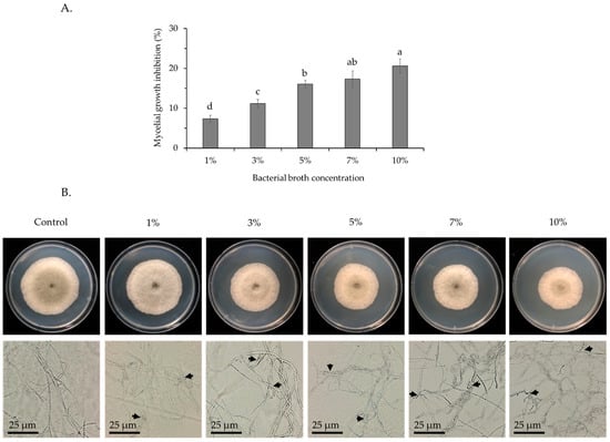 Moreover, the VOCs produced from different concentrations of B. velezensis CE 100 reduced the mycelial growth of C. gloeosporioides (Figure 2). The highest rate of reduction in mycelial growth of 20.0% was observed at a bacterial concentration of 10%, while the lowest reduction rate of 7.4% was recorded at a concentration of 1% (Figure 2A). The antagonistic activity VOCs from each of the different concentrations (1%, 3%, 5%, 7%, and 10%) of B. velezensis CE 100 broth culture caused hyphae abnormalities such as coiling and discoloration, which led to a reduction in the rate of mycelial growth of C. gloeosporioides (shown by the arrows). However, the mycelia in the control groups exhibited normal growth, with straight growing hyphae (Figure 2B). The difference between the hyphae morphologies of C. gloeosporioides exposed to the treatment and the control group indicates a notable antifungal effect of VOCs from B. velezensis CE 100.