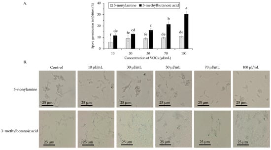 Antifungal activity of 5-nonylamine and 3-methylbutanoic acid against spore germination of Colletotrichum gloeosporioides. (A) Percentage reduction in spore germination and (B) images showing a reduction in spore germination and germ tube elongation of C. gloeosporioides exposed to different concentrations of (a) 5-nonylamine, and (b) 3-methylbutanoic acid. Error bars represent the standard deviation of the mean (n = 3). Means with different letters are significantly different (p < 0.001).