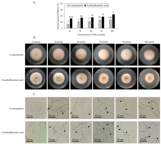 Antifungal activity of different concentrations of 5-nonylamine and 3-methylbutanoic acid against mycelial growth of Colletotrichum gloeosporioides. Percentage reduction in mycelial growth (A), images showing a reduction in mycelial growth when the fungi were exposed to 5-nonylamine and 3-methylbutanoic acid (B), and the deformation of hyphae morphology in 5-nonylamine and 3-methylbutanoic acid (C) treatments. Arrows indicate deformed mycelia after treatment with different concentrations of individual VOCs. Error bars represent the standard deviation of the mean (n = 3). Means with different letters are significantly different (p < 0.001).
