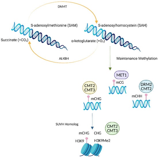 The family of methyltransferases catalyze the establishment of 5mC by transferring a methyl group from S-adenosylmethionine (SAM) to the substrate (Figure 1) [28], while the maintenance of pre-existing methylation continues particularly on CG and CHG motifs, which are known as symmetrical sites as they are read in 5′ to 3′ direction. This symmetry after each round of replication provided a base for cytosine methylation on a mother strand and transfer to daughter strands. Following the DNA repair mechanism, methylation can take place, allowing newly synthesized strands to be methylated. Comparable to CHG and CHH methylation, CG methylation also takes place over gene bodies, while the CHG and CHH sequence context is fully involved in transcriptional gene silencing (TGS) and heterochromatin formation [50].