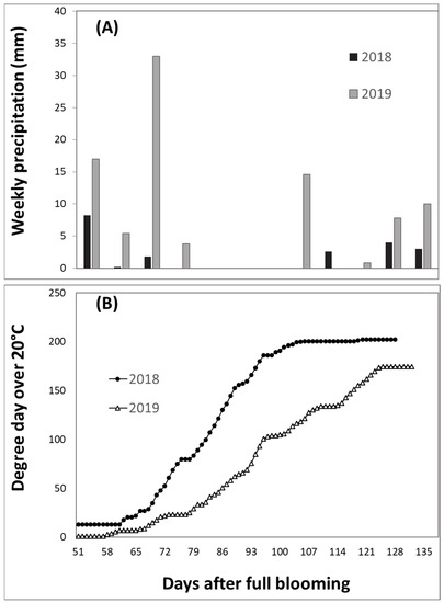 Weekly precipitation (A) and accumulated degree days above 20 °C that were calculated from the daily mean temperature (B) from early summer to harvest in 2 years in Cawston, BC (data obtained for Cawston, BC at Farmwest Historical Weather data site https://farmwest.com/climate/calculators, accessed on 13 May 2021).