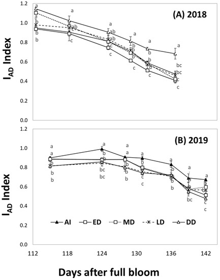 Effects of different irrigations on the loss of chlorophyll in fruit skin measured weekly as the IAD Index of Ambrosia™ apples in a conventional orchard in 2018 (A) and 2019 (B), respectively. The points are the LS means ± standard error of the mean. Means with different letters within a date are pairwise significant (p ≤ 0.05) differences. AI = adequate irrigation; ED = early-summer deficit irrigation (DI); MD = middle-summer DI; LD = late-summer DI; DD = double-period DI.