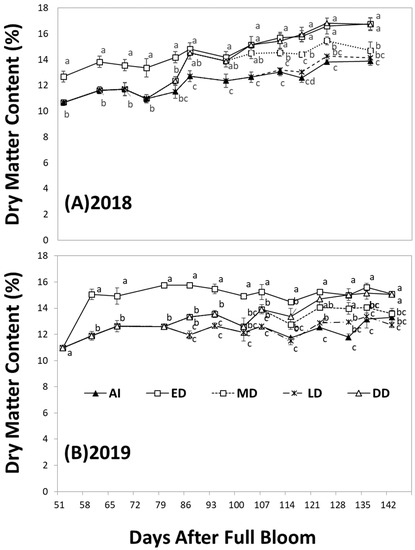Effect of different irrigations on the seasonal changes of the DMC follow-up treatment in Ambrosia™ apples measured with an F-750 NIR spectrometric device in a conventional orchard in 2018 (A) and 2019 (B), respectively. The points are LS means ± the standard error of the mean. Means with different letters in a date are pairwise significant (p ≤ 0.05) differences. AI = adequate irrigation; ED = early-summer deficit irrigation (DI); MD = middle-summer DI; LD = late-summer DI; DD = double-period DI.