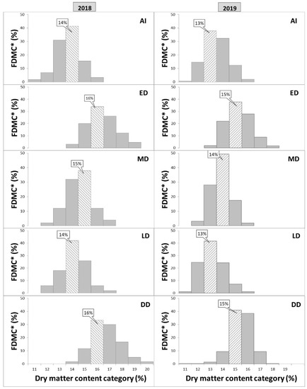Frequency distribution of the predicted dry-matter content (FDMC*) categories of Ambrosia™ apples near harvest from a commercial orchard in Cawston, BC, Canada. The left panel shows the category of 2018. The right panel shows the category of 2019. FDMC: frequency in dry-matter categories, as illustrated by the apple DMC analysis [14]. AI = adequate irrigation; ED = early-summer deficit irrigation (DI); MD = middle-summer DI; LD = late-summer DI; DD = double-period DI. The number within a text box on top of the highest column in each panel indicates the principal (or highest) category of DMC, which was determined with analysis using the SAS General Linear Models procedure (p ≤ 0.05).