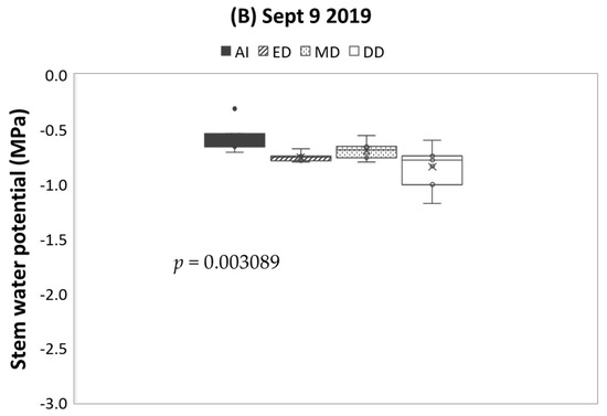 Stem water potential in AmbrosiaTM trees in late summer. The data were collected on 6 September (125 days AFB) 2018 (A) and on 9 September (128 days AFB) 2019 (B), with eight replicates, respectively. The statistical significance between irrigation treatments was analyzed using an ANOVA single-factor model (p ≤ 0.05). The box shows the minimum, first-quartile, median, third-quartile, and maximum values. The bars with error bars are means ± standard errors. AI = adequate irrigation; ED = early-summer deficit irrigation (DI); MD = middle-summer DI; DD = double-period DI.