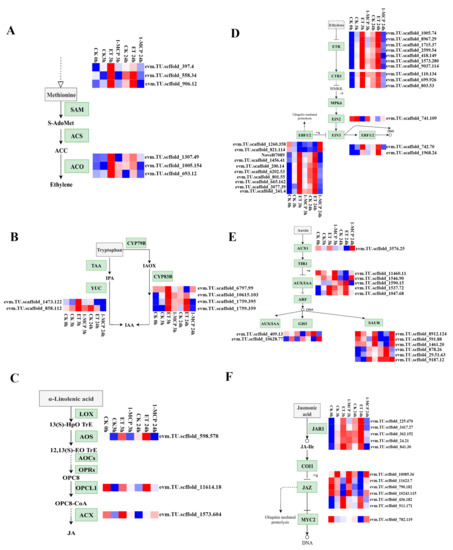 DEGs of plant hormone biosynthesis and signaling. (A) Ethylene biosynthesis-related genes. (B) IAA biosynthesis-related genes. (C) JA biosynthesis-related genes. (D) Ethylene signaling-related genes. (E) IAA signaling-related genes. (F) JA signaling-related genes. Different color bands represent the different expression levels of the individual samples. The red bands represent high expression levels and the blue bands represent low expression levels. DEGs, differentially expressed genes; IAA, indole-3-acetic acid; JA, jasmonate.