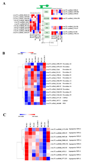 Heatmap analysis of DEGs involved in various processes. Chlorophyll synthesis and degradation (A), ROS (reactive oxygen species) (B), and aquaporin signaling pathway (C) are shown. DEGs, differentially expressed genes.