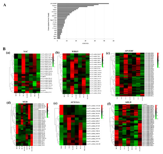 Identification of transcription factors (TFs) differentially expressed with ethylene and 1-MCP treatment. (A) Distribution of transcription factor family members in differentially expressed genes. (B) Heatmap analysis of transcription factor family genes in post-harvest cut chrysanthemum in response to ethylene treatment. (a) NAC; (b) WRKY; (c) AP2/ERF; (d) MYB; (e) AUX/IAA; and (f) bHLH. Red represents high expression and green represents low expression.