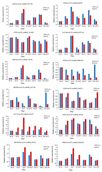 To validate expression of the DEGs, 12 genes were randomly selected and quantified by using qRT-PCR. The results showed that these genes demonstrated expression profiles highly consistent with the expression levels generated from the RNA-seq analysis, suggesting that the RNA-seq data are reliable (Figure 6).