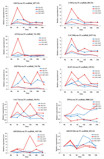 In order to determine if the expression patterns of the DEGs are conserved across different cultivars, the expression patterns of representative DGEs were detected in the ethylene-sensitive cut chrysanthemum ‘Nannong Huanglongyu’ and ethylene-insensitive ‘Fen Luoli’ subjected to ET or 1-MCP treatment (Figure 7 and Figure S1). In general, the DEGs can be divided into three categories: upregulated at the early (3 h) stage after ethylene treatment, upregulated at both early and late stages showing a “double peak”, and downregulated after ethylene treatment.