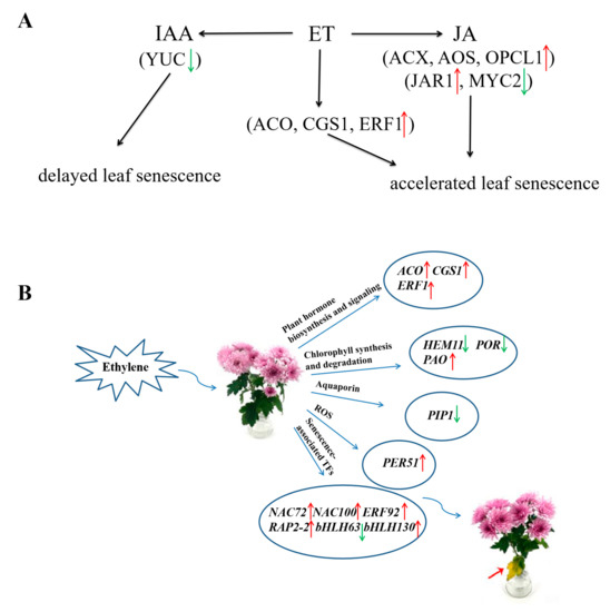 Working model of ethylene (ET)-mediated chrysanthemum leaf senescence. (A) Ethylene-induced leaf senescence module by regulating other plant hormones. (B) ET may promote senescence of chrysanthemum leaves by regulating genes that are mainly related to plant hormone biosynthesis and signaling (e.g., ACO, CGS1, and ERF1), chlorophyll synthesis and degradation (e.g., HEMM11, POP, and PAO), aquaporin (e.g., PIP1), ROS (e.g., PER51), and senescence-associated transcription factors (TFs) (e.g., NAC72, NAC100, ERF92, RAP2-2, bHLH63, and bHLH130). Red arrows represent upregulation, and green arrows represent downregulation. ROS, reactive oxygen species.