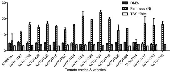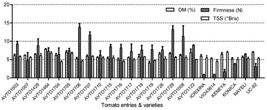 Postharvest fruit quality of tomato cultivated during the rainy season. DM = Dry matter and TSS = total soluble solids. Error bars indicated the standard error of means (S.E.M).