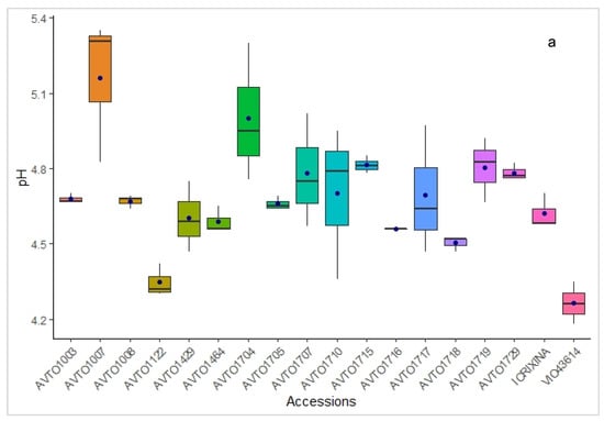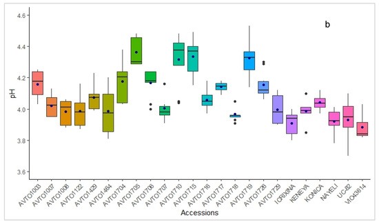 pH of tomato entries during rainy (a) and dry season (b) production consecutively with n = 10 fruits per entry. The line within each box indicates the median value of the data and the individual dots outside of the box are outliers.