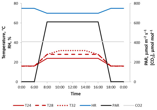 Daily programming of climatic conditions inside the growth chamber: photosynthetically active radiation (PAR), relative humidity (RH), CO2 concentration, and temperature for treatments T24, T28, and T32.