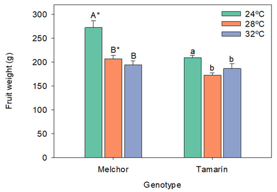 Effect of temperature (24 °C, 28 °C, and 32 °C) on fruit weight of Melchor and Tamarín fruits. The data are presented as the treatment means (n = 6) ± S.E. Different lowercase letters indicate significant differences between temperatures in Melchor and different uppercase letters indicate significant differences between temperatures in Tamarín. * Denotes significant differences between two cultivars grown under the same temperature conditions.