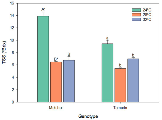 Effect of temperature (24 °C, 28 °C, and 32 °C) on total soluble solids (TSS) of Melchor and Tamarín fruits. The data are presented as the treatment means (n = 6) ± S.E. Different lowercase letters indicate significant differences between temperatures in Melchor and different uppercase letters indicate significant differences between temperatures in Tamarín. * Denotes significant differences between two cultivars grown under the same temperature conditions.