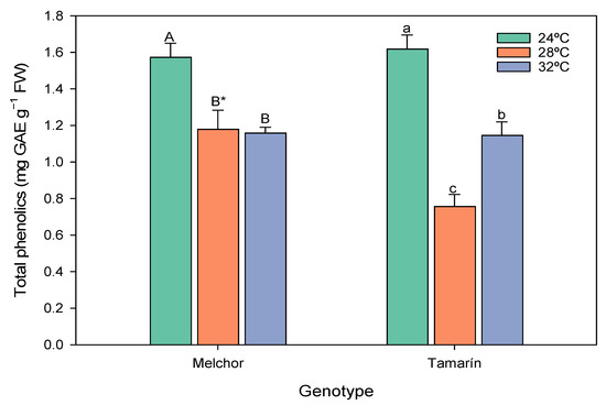 Effect of temperature (24 °C, 28 °C, and 32 °C) on total phenolics of Melchor and Tamarín fruits. The data are presented as the treatment means (n = 6) ± S.E. Different lowercase letters indicate significant differences between temperatures in Melchor and different uppercase letters indicate significant differences between temperatures in Tamarín. * Denotes significant differences between two cultivars grown under the same temperature conditions.