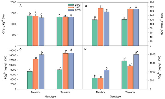 Effect of temperature (24 °C, 28 °C, and 32 °C) on anions content: (A) chlorides (Cl−), (B) nitrates (NO3−), (C) phosphates (PO43−), and (D) sulfates (SO42−) of Melchor and Tamarín fruits. The data are presented as the treatment means (n = 6) ± S.E. Different lowercase letters indicate significant differences between temperatures in Melchor and different uppercase letters indicate significant differences between temperatures in Tamarín. * Denotes significant differences between two cultivars grown under the same temperature conditions.