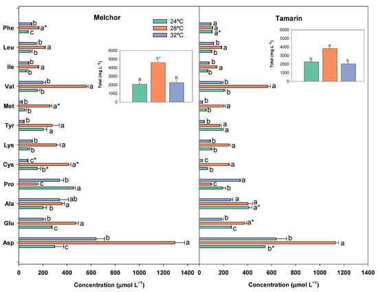 Effect of temperature (24 °C, 28 °C, and 32 °C) on amino acid concentrations of Melchor and Tamarín fruits. The data are presented as the treatment means (n = 6) ± S.E. Different lowercase letters indicate significant differences between temperatures in Melchor and different uppercase letters indicate significant differences between temperatures in Tamarín. * Denotes significant differences between two cultivars grown under the same temperature conditions.