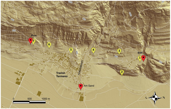 This study’s geographical focus area was the South Tyrol wine-growing region located in northern Italy within the Alps, which is a vast geographically varied and challenging environment. Specifically, this wine-growing area is located slightly south of Bolzano in the Bassa Atesina wine sub-region, within a small portion of territory comprising only 6 sq. km around the village of Tramin (Figure 1). Terroir analysis was performed on seven vineyards, identified in this study as vineyards V1–V7. As the basic premise of the study was to maintain a unique winery’s viticultural practice, the wines of the seven plots were made in the same winery. These vineyards were chosen based on the winemaker’s experience, who observed different quality and style expressions in their wines over the last decades.