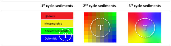 Conceptual illustration of Alpine soil sediments that increase in mineral and physical complexity as they are remixed in successive sedimentary phases typical of local event stratigraphy. First-cycle sediments have a close connection and proximity to the parent rock. Second-cycle sediments are composed of first-cycle materials (eroded and retransported away from the first deposition place) mixed with new first-cycle materials. Third-cycle sediments are formed by geomorphological processes that eroded and resedimented first- and second-cycle sediments. The geomineral and textural complexity becomes progressively more intense and it is difficult to recognise any parent rocks.