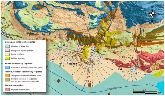 Geological information of the Tramin area. V1–V7 indicate the studied vineyards. All vines are located in sedimentary structural units (Synthems). These units are so heterogeneous and complex that they can appear on the geological map, as they were built in many lithostratigraphic events and sedimentary cycles.