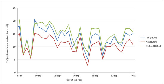 Daily differences between the maximum and minimum temperatures during the controlled pre-harvest month. See Figure 1 for the geographical position of the monitoring stations.