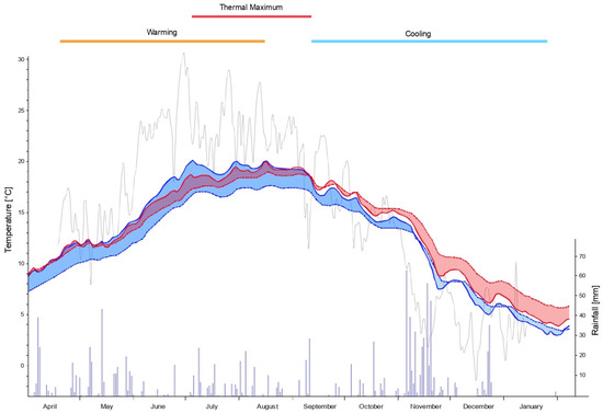 Annual thermal cycle in the subsoils during the April–January period. The curves represent vineyard V1 (blue) and V7 (red) at a depth between 80 cm (solid line) and 120 cm (dashed line). The grey curve is air temperature, and the bars represent the amount of rainfall. Note that the V1 subsoil, which is less wet, becomes warmer more easily in summer and colder more easily in autumn. It is also more sensitive to rainy events and demonstrates a more evident and stable decrease in temperature throughout the pre-harvest period. Vineyards are harvested in mid-October.