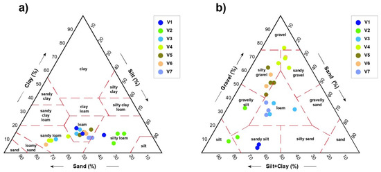 An analysis of the ternary diagram proposed by the USDA (Figure 6a) based on a particle size test of the medium-fine fraction (<2 mm) found that the soils contained a low clay fraction and varied from silty loam to sandy loam. Most soils were characterised by an intermediate loam composition. This texture test was only partial, as it did not analyse the soil skeleton’s gravel fraction. It favoured the clay fraction and thus did not provide sufficient geopedological information to distinguish between soils in the Alpine context, in which sediments predominantly comprise coarse gravelly fractions compared to the fine clay fraction. In our case, we found that the soil gravel fraction was 41.1%, on average, and the clay fraction was only 3.7%.