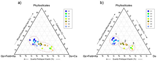 Triangular plots were constructed to examine the results of the quantitative XRD analyses (Figure 7). The mineral phases that best define the depositional processes typical of the valley side where the vineyards are located were detected and evaluated. This helped recognise the parent rock that largely influenced the nature of the resulting soil (cf. Material and methods §2. siliceous, dolomitic or terrigenous) and the sedimentary process that formed the soil. The minerals were subdivided according to their petrographic origin and agronomical importance into carbonate (dolomite and/or calcite), silicate and clay minerals (phyllosilicates). Figure 7a highlights vineyards V1 and V3, with a predominantly siliciclastic component (quartz + feldspars + phyllosilicates) and a lower carbonate fraction. Vineyard V7 has an important siliciclastic component and shows a partial increase in calcite minerals. Found in the south of Tramin, this mineral represents a characteristic marker mineral from rocks outcropping only in the studied area’s immediate proximity. In the second group of vineyards (V2 and V4–V7), which was less delimiting than the previous group, the carbonate mineral composition (dolomite + calcite) became progressively larger.