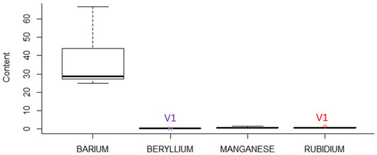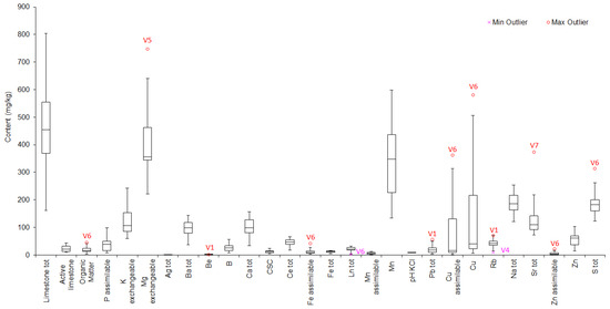 Boxplot of soils’ elemental mineral composition. Measured statistical indices: The middle bar in the box represents the median. The circles and cross symbols represent respectively the maximum and minimum statistical outliers. Beside the outlier symbol is the vineyard label. Data are presented in the Supplementary Materials (see Table S1).