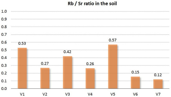 The analysis of the Rb/Sr ratio helped assess whether any parental link existed between parent rocks and soil-forming minerals in the studied vineyards (Figure 9). For example, regarding vineyards V5 and V6, the geological origins of the so-called local “mixed soils” were indefinite. Vineyard V5’s high Rb/Sr ratio indicates that its soil contains minerals from distant metamorphic rocks present only in the far north of Tramin. However, vineyard V6’s low Rb/Sr ratio indicates an origin from closer rocks, that is, the high dolomite mountains on the valley side near the village of Tramin.