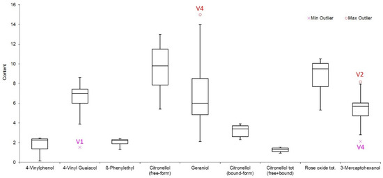 The in-depth analysis of the individual vineyards identified micro-abiotic environmental variables, which could be the origin of the differences measured in varietal aromas. An oenological–chemical analysis found slightly different aromatic profiles in all wines. As previously explained, the terroir differences were more evident when comparing V1 and V4, which had the most varying and extreme soil characteristics. Correspondingly, the oenological products of V1 and V4 contained some key elements that differed significantly: V1 grapes had much higher amino acid concentrations (L-alanine, L-arginine, L-glutamine, L-asparagine, L-serine and L-threonine), and V1 wine had more equilibrated rose oxides and flavanol phenolic compounds with a spicy note (4-vinylphenol and 4-vinyl guaiacol) than the other wines. However, in V4′s wine, the thiol compounds with a tropical scent (3-mercaptohexanol) were significantly lower. Regarding the higher amino acid content in V1 grapes, note that these organic molecules are actively involved in winemaking processes, optimising and promoting the biochemical transformation of secondary aromas into tertiary ones [73], and could improve a wine’s aromatic potential [74]. This result is linked to the well-established evidence of aromatic typicality consistently measured over the past few decades in wines from this specific vineyard. Specifically, V1′s wine has distinguished itself over the years through a distinct and original property of evolving tertiary aromas over the course of its life.