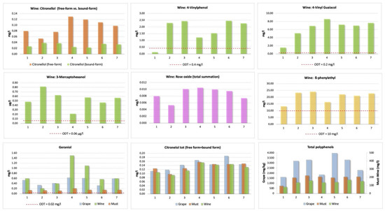 Products from the 2019 harvest of the Gewürztraminer cultivar from the seven different vineyards, totaling 21 grapes (harvested on 3 and 4 October 2019), must and wine samples, were analysed. The targeted oenological chemical analysis was performed at the same time point and included the basic chemical–physical parameters, mineral profile (ICP MS-ICP OES), amine profile (high-performance liquid chromatography method), total polyphenols (spectrophotometric method), flavonoid polyphenols (profile), spectrophotometric method and aroma profile, including varietal compounds in free and bound forms (gas chromatography-mass spectrometry method). Oenological chemistry analysis followed the official methods of the International Organisation of Vine and Wine and the European Union regulations, as listed in [51]. Based on the analytical results, this study focused mainly on the varietal volatile aromatic substances characterising the Gewürztraminer variety [52,53,54]. Aspects related to the technological choices made in the vineyard and cellar were not evaluated because they were kept constant for all the vineyards studied.