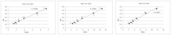 The results of the present study concerned some elemental minerals measured in soils, grapes, musts and wines, indicating the presence of direct links in the entire food chain: Rb/Sr isotopic ratios and the Ba, Rb, Mn and Be contents. The study showed that the mineral composition pattern was transferred through the soil–wine system and that the differences observed in the soils were reflected in the grapes, musts and wines, but not in all the elements. These results confirm the correctness of the adopted research methods and the mineral fingerprint approach’s geographical origin traceability of oenological foods. Furthermore, the analyses indicated that many of the soil’s minerals were actively involved in winemaking processes, interacting in different ways with yeast or biochemical processes, thereby altering the minerals’ final content in the seven wines. The results suggest that in complex geo-pedological conditions, both vineyards and winemaking are important, as mixing grapes from several vineyards, even if these are quite close to each other, can already change the wine’s elemental composition.