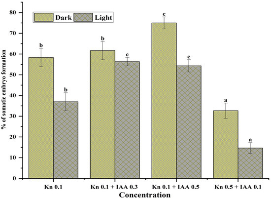 The MS medium cultured vials augmented with 0.1 mg L−1 Kn and 0.5 mg L−1 IAA, incubated in the dark, produced more somatic embryos (77.34 ± 0.05%) than the cultured vials fortified with the same PGRs (0.1 mg L−1 Kn and 0.5 mg L−1 IAA) incubated in the light (56.21 ± 0.07). Likewise, other concentrations showed similar patterns of somatic embryo formation. Thus, it was demonstrated that darkness had a significant impact on somatic embryo formation in Aconitum violaceum (Figure 3). In all trials, cultures that were incubated in the dark for a minimum of 10–25 days may facilitate the induction of somatic embryos.