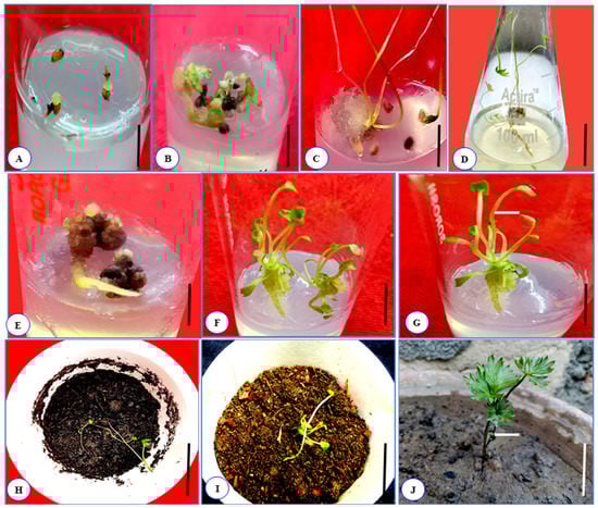 Callus development and plant regeneration from the seeds of Aconitum violaceum in MS basal medium enriched with various concentrations of PGRs, either alone or in combination: (A) callus induction in MS medium + 0.5 mg L−1 2,4-D; (B) callus induction in MS medium + 0.1 mg L−1 Kn; (C) multi-shoot formation in MS medium + 0.1 mg L−1 Kn; (D) root induction when sub-culture in MS medium is augmented with 0.1 mg L−1 Kn + 0.5 mg L−1 IAA; (E) embryogenic callus production and root induction in MS medium fortified with 0.1 mg L−1 Kn; (F,G) multiple shoot and root development from embryogenic callus when sub-cultured in MS medium enriched with 0.1 mg L−1 Kn + 0.5 mg L−1 IAA; (H,I) hardened plants in the pots containing loamy soil, coco-peat, and vermicompost (1:1:1 v/v); (J) plant acclimatized in green house. Scale bar (A–G) represents 5 mm; (H–J) represents 1 cm.